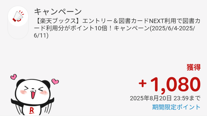 2025年10月に10000円の支払いをして1080ポイントもらったのでスクショしておきます。いつからかキャンペーンにポイント上限が1000ポイントになりましたので、1080ポイントもらえることはなくなりました。